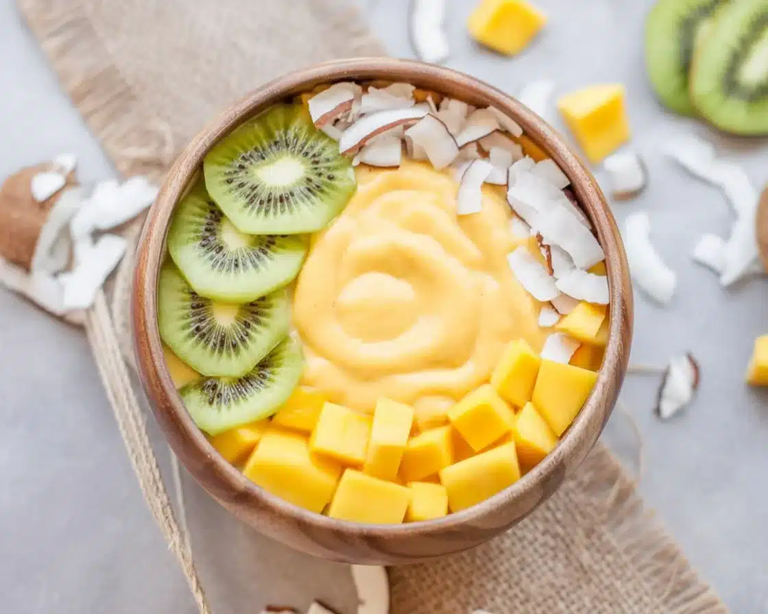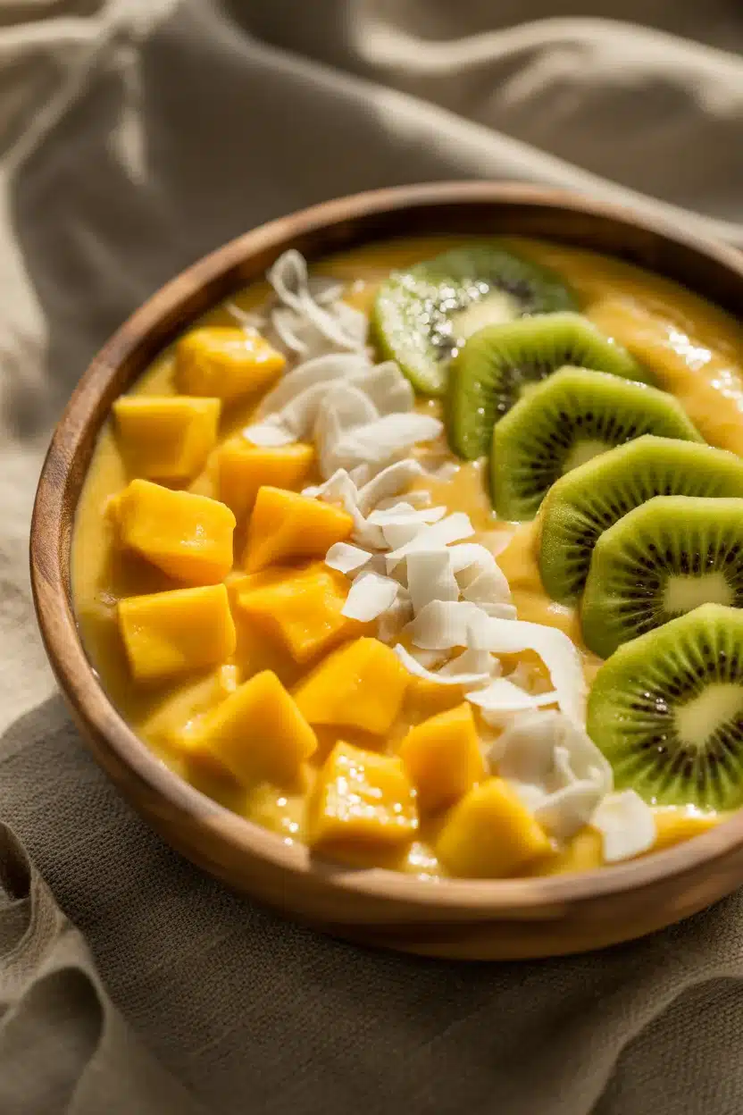 A thick, creamy smoothie bowl made with frozen mango and pineapple, perfect for busy mornings.