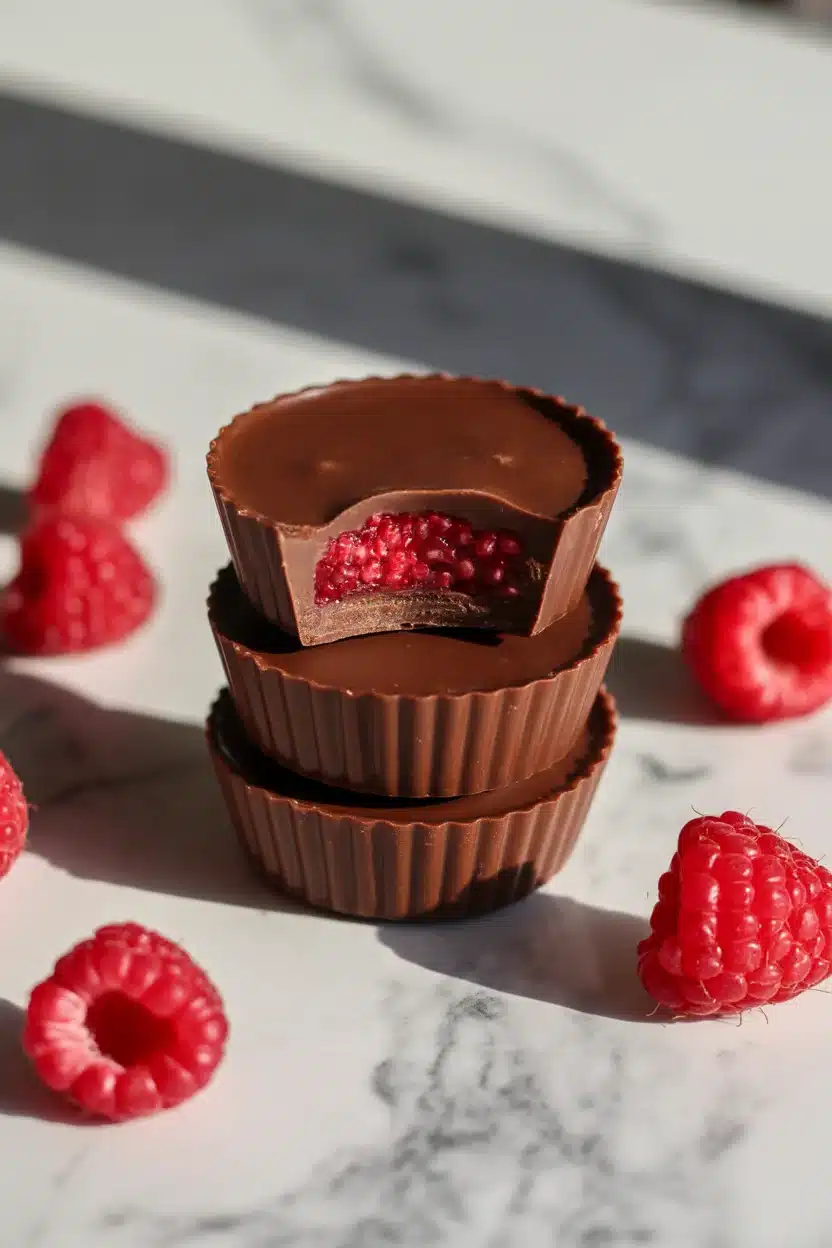 Think of these as chilled, bite-size layers of creamy filling and juicy berries tucked into a chocolate shell. Each cup has a soft, lightly sweet center that feels like a cross between yogurt cheesecake and a berry parfait. The chocolate snaps when you bite in, then the filling melts on your tongue. The raspberries do their thing and brighten everything up. That contrast is the reason I love them.