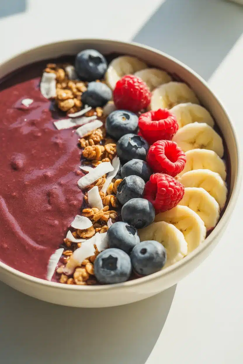 Out of bananas? Use frozen mango for creaminess and a softer sweetness. It blends beautifully with acai. If you want a lower sugar base, try frozen cauliflower rice. It sounds odd, but it adds body without flavor, and once you add berries, you won’t notice it.